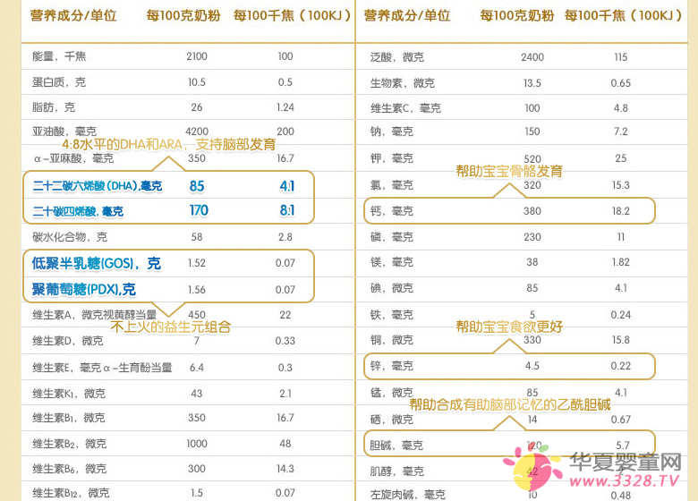 這里必須說一個(gè)很關(guān)鍵的成分:DHA,據(jù)說又叫腦黃金,雖然有點(diǎn)俗但也可以看得出它對(duì)腦發(fā)育的重要性了,老公說這個(gè)成分不只對(duì)智力有很大影響,還能影響視力呢,所以他選奶粉最看重的就是DHA配方。