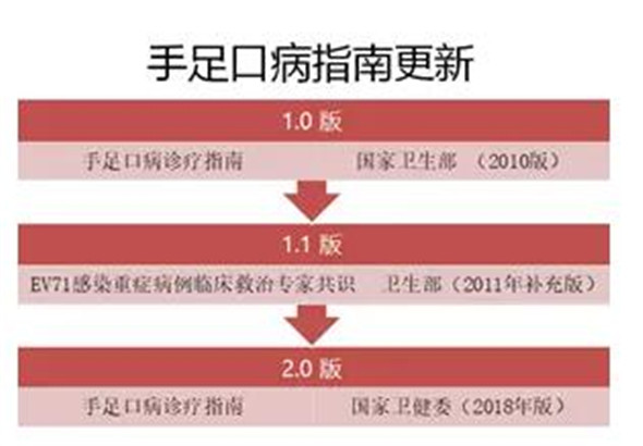 2010年衛(wèi)生部發(fā)布了第一個(gè)《手足口病診療指南》,即1.0版。相隔一年,由于面臨腸道病毒71型(EV71)流行高峰,于是又出臺(tái)了《腸道病毒71型(EV71)感染重癥病例臨床救治專家共識(shí)》,即1.1版。